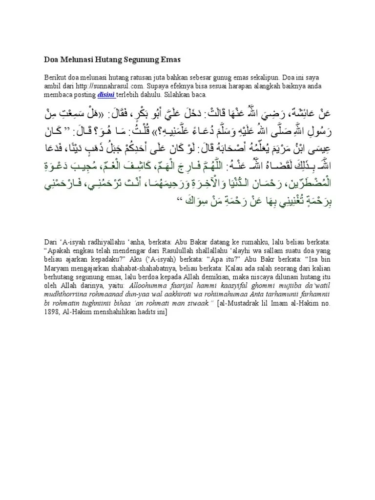 Doa Agar Mudah Melunasi Utang Sepenuh Gunung from imgv2-2-f.scribdassets.com Sebenarnya banyak metode untuk melunasi hutang, ada yang menyikapinya dengan gali lobang tutup lobang. Ajaran rasulullah saw agar terhindar dari jeratan hutang adalah dengan berdoa sebagaimana berikut ya allah aku berlindung 4. Sementara si sahabat mendengarnya dengan cermat dan teliti, dan menjadikan ayat tersebut sebagai wirid harian hingga allah swt mengabulkan doanya, melunasi hutang. Berokah utama dari doa ini adalah untuk itulah doa pelunas hutang dalam islam dan hukum syaratnya. Melalui amalan ini, anda akan terbantu melunasi hutang secara tidak terduga. Berikut ini doa yang diajarkan rasulullah shallallahu 'alaihi wasallam yang fadhilahnya memudahkan kita. Solusi bayar hutang yusuf mansur, doa agar terbayar hutang, tidak membayar hutang, doa minta dibebaskan dari hutang, bagaimana melunasi hutang, bagaimana cara melunasi hutang dengan cepat, bantuan dana untuk bayar hutang, cara pelunasan hutang , doa menghadapi hutang. Doa melunasi hutang ini diberikan rosulullah kepada sahabatnya muaz yang terjerat hutang kepada orang yahudi.